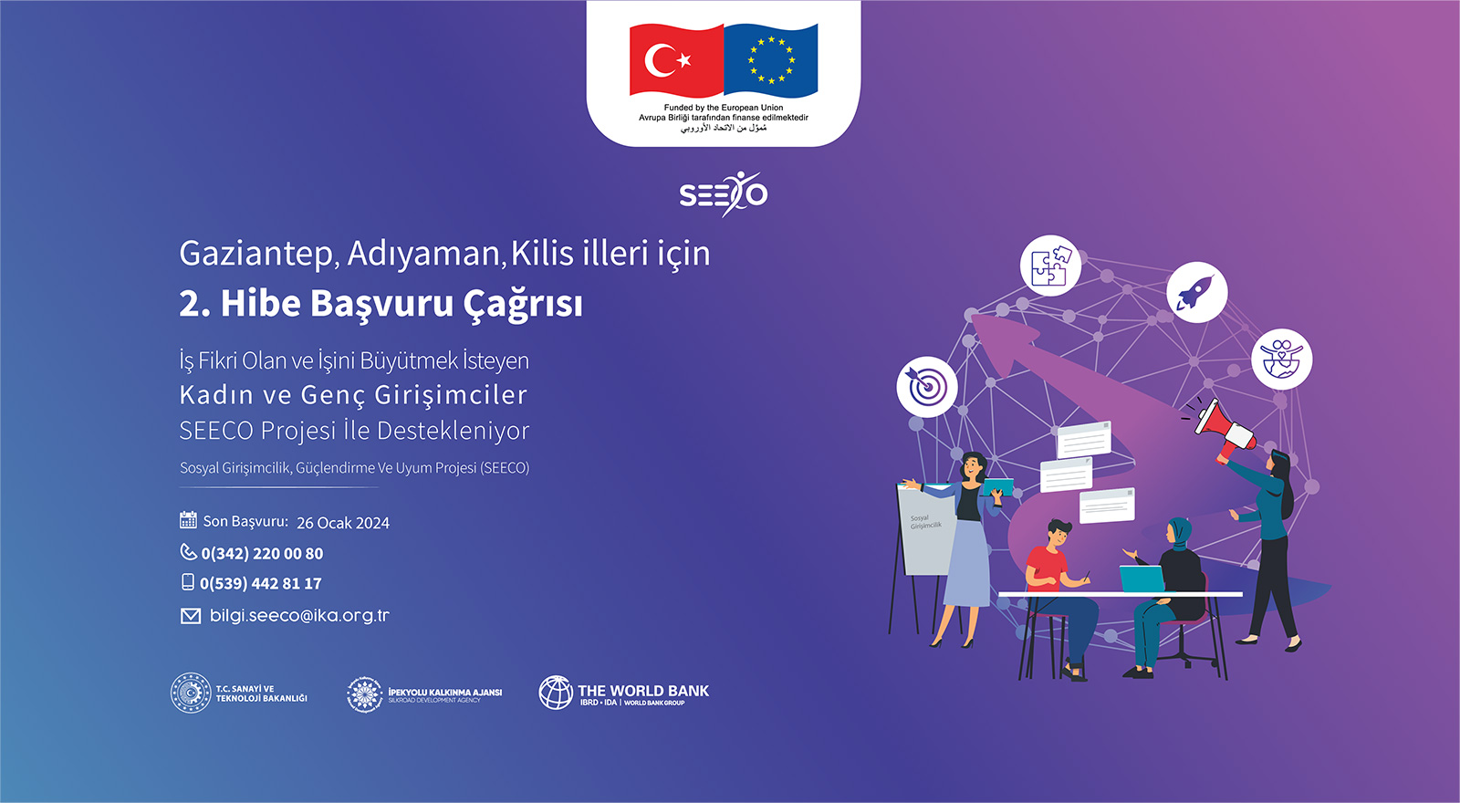 Avrupa Birliği tarafından finanse edilen, T.C. Sanayi ve Teknoloji Bakanlığı Kalkınma Ajansları Genel Müdürlüğü ve Dünya Bankası koordinasyonuyla yürütülen Sosyal Girişimcilik, Güçlendirme ve Uyum Projesi (SEECO) kapsamında Gaziantep, Adıyaman ve Kilis illerinde kadınlara ve gençlere yönelik olarak sosyal girişimcilik odağında alt hibe programı ilana çıkmış bulunmaktadır.